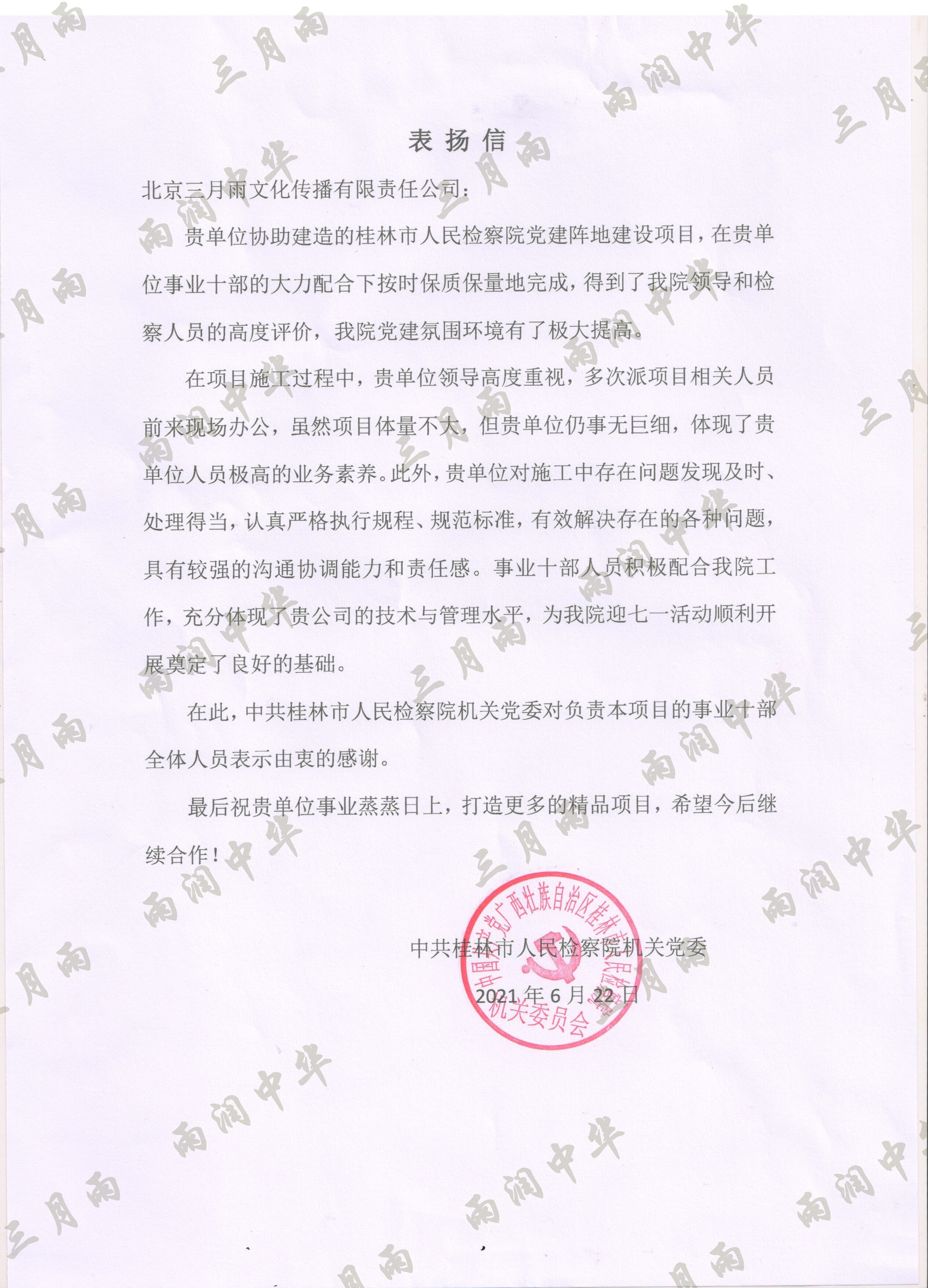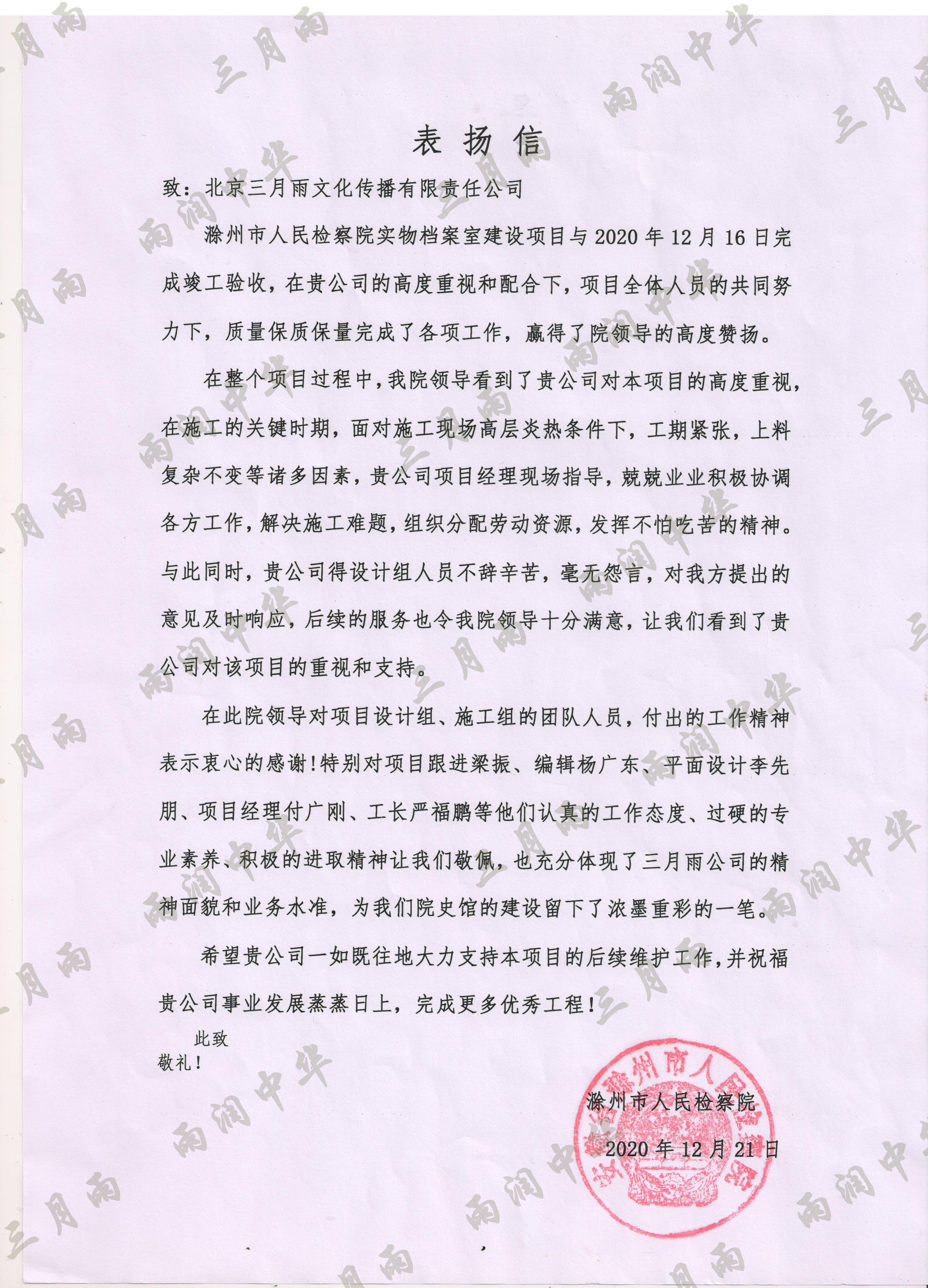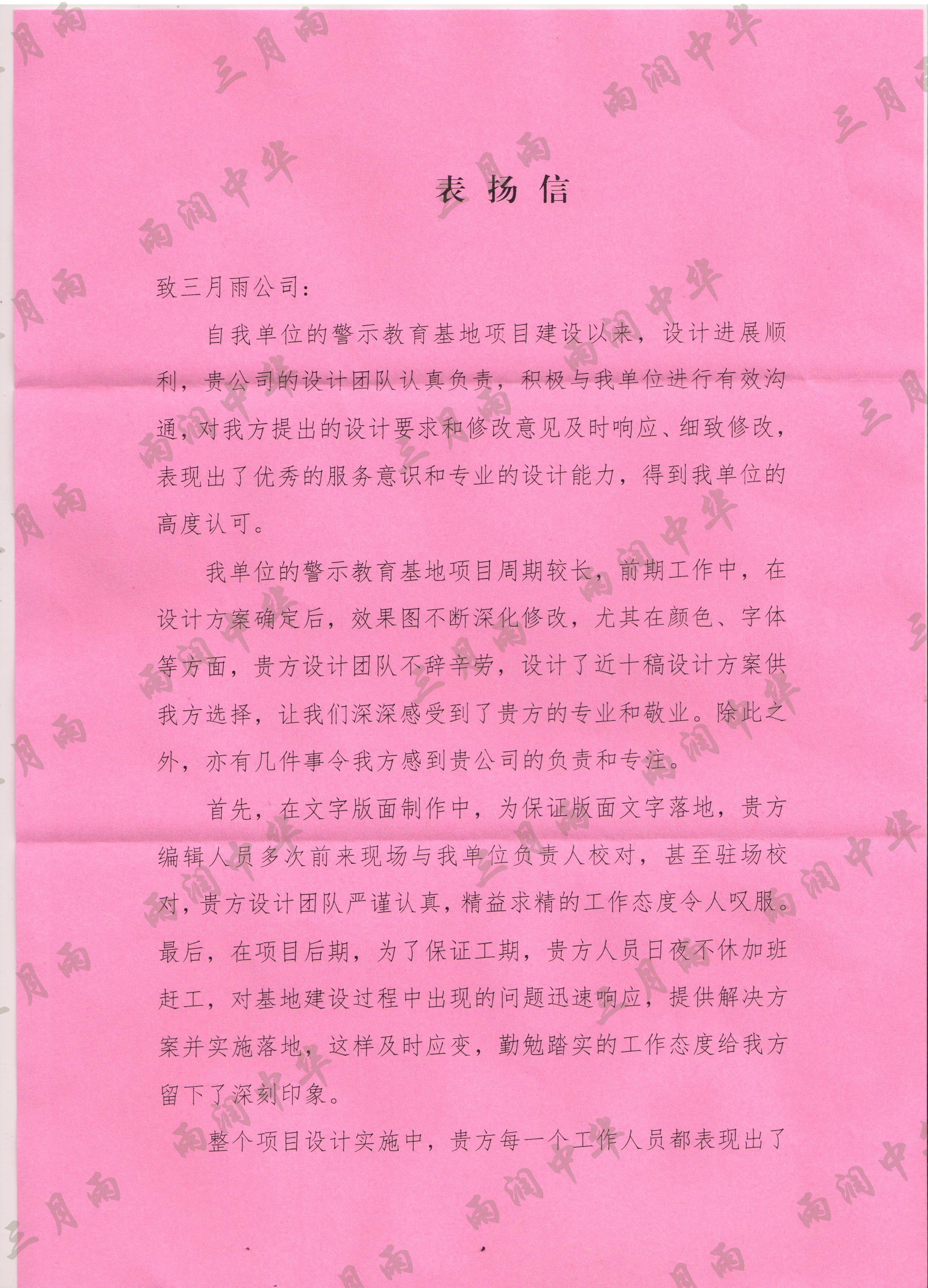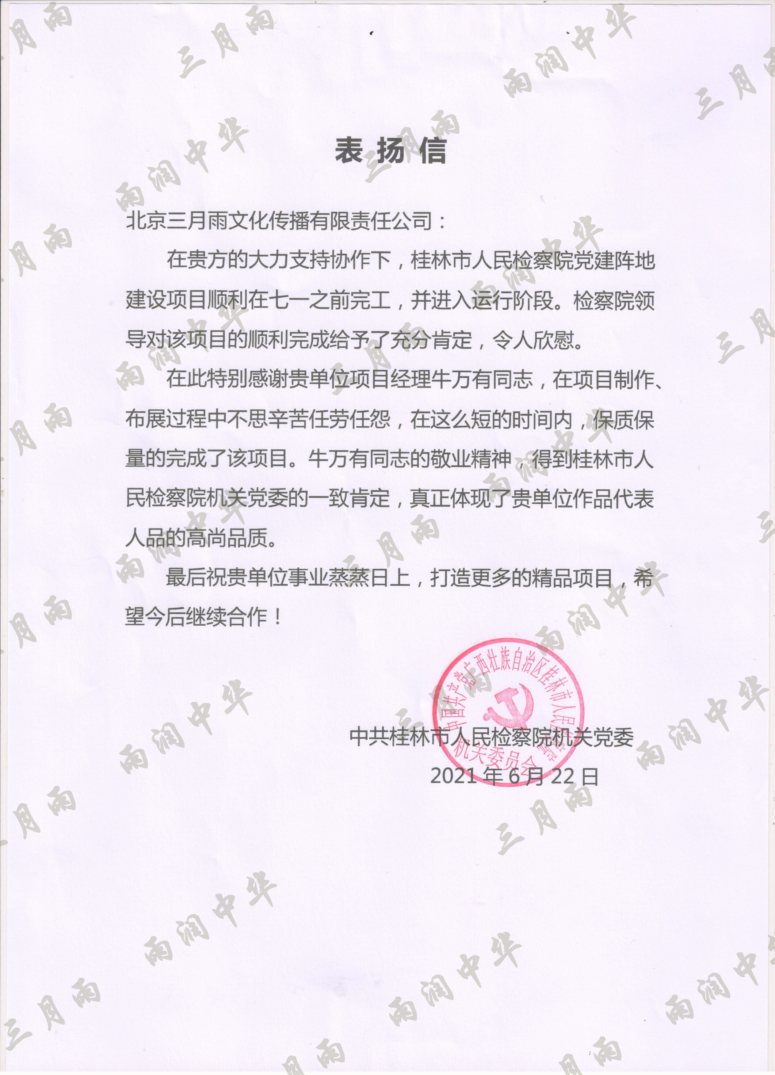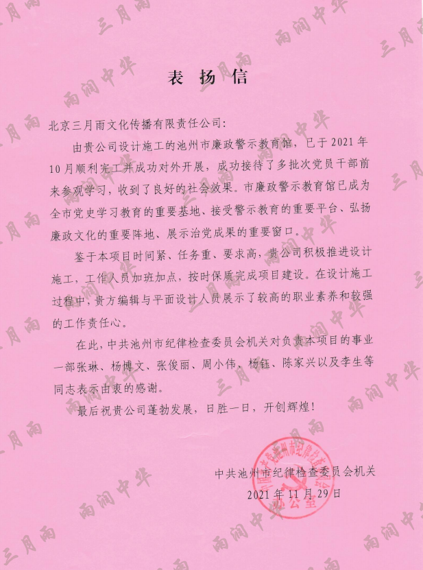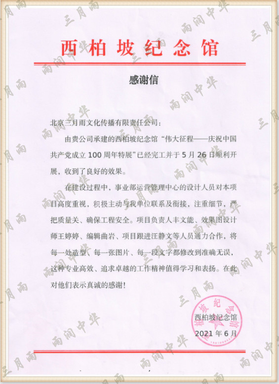 以质量求生存,以信誉求发展。公司既要“金杯”“银杯”,更要客户的口碑。每一个项目务求特色第一、质量第一、信誉第一,让客户满意。截至目前,共收到全国人大常委会机关纪委等国家机关和省、市、县级客户表扬信(感谢信)近