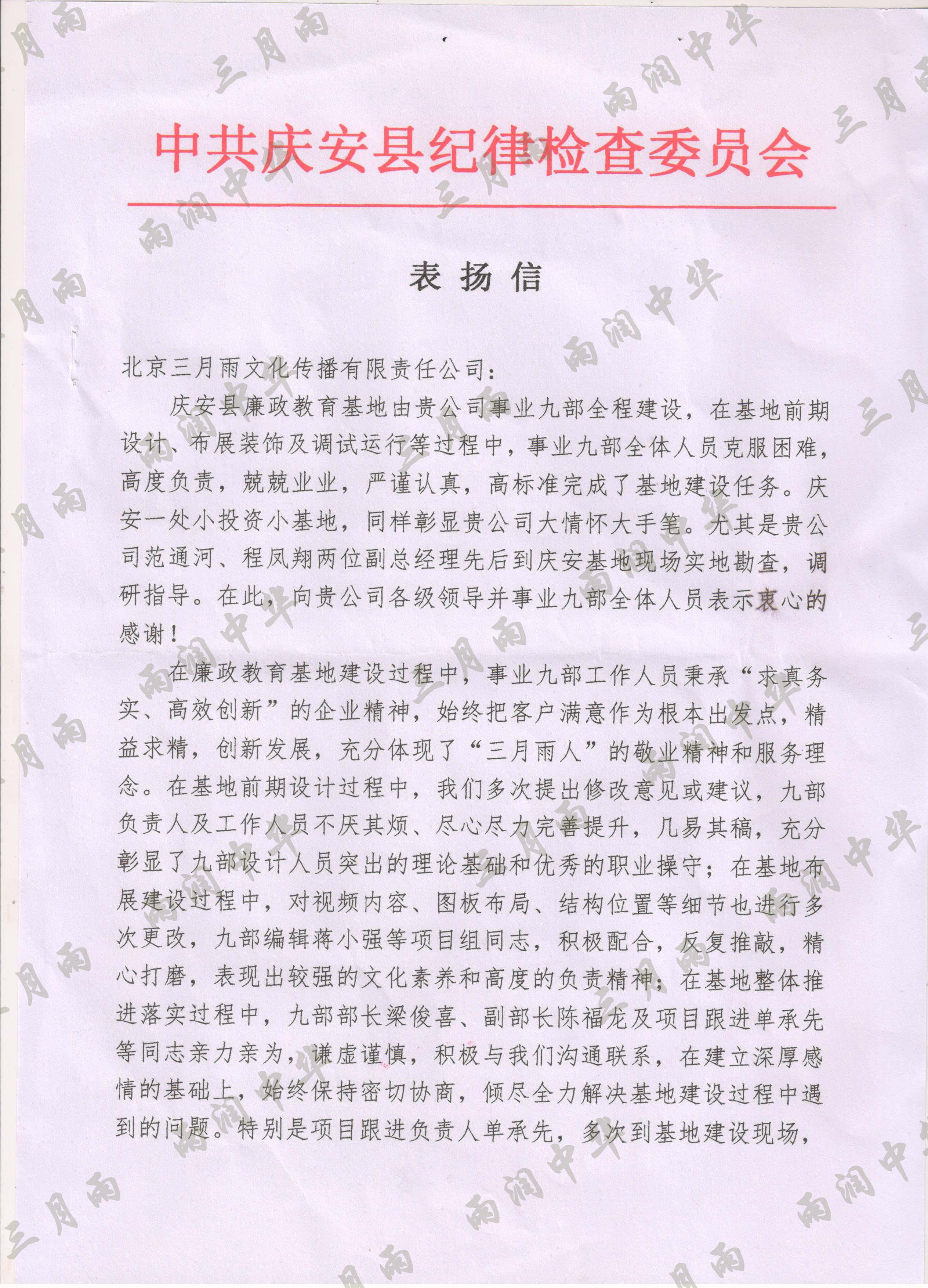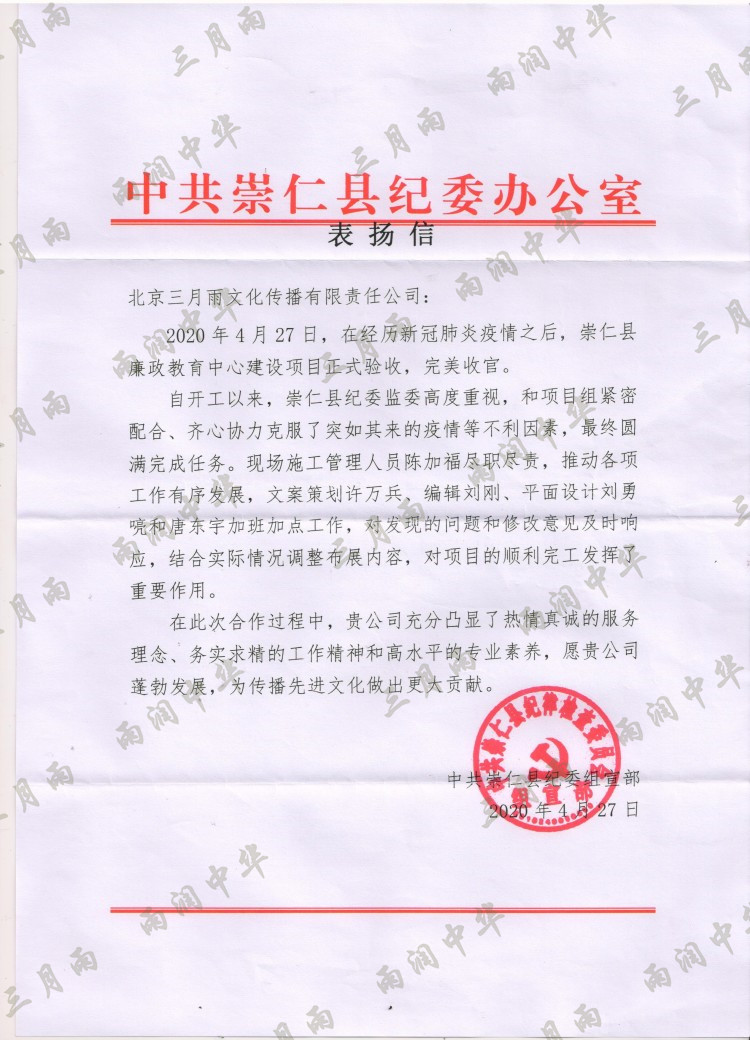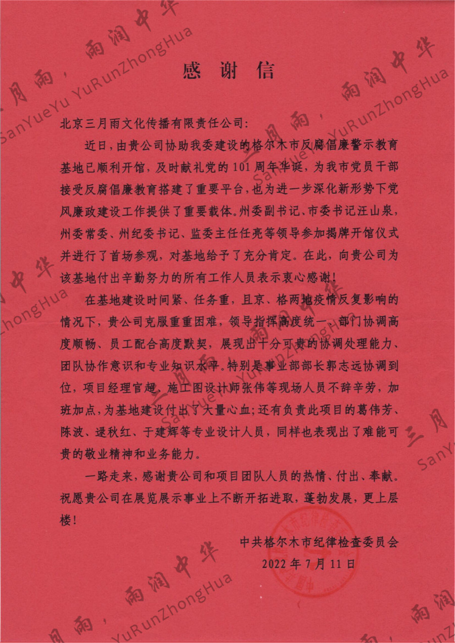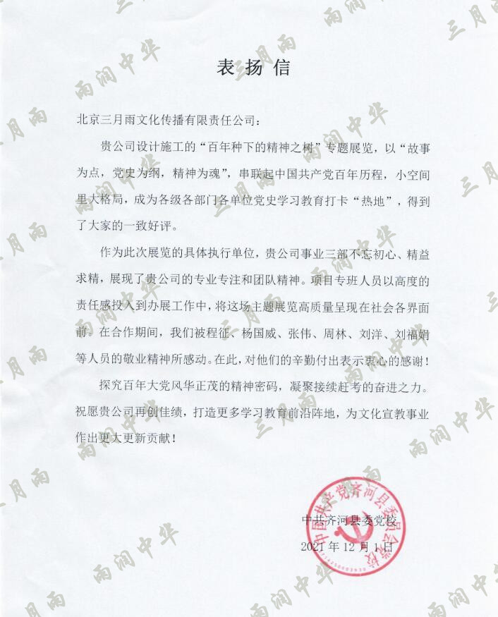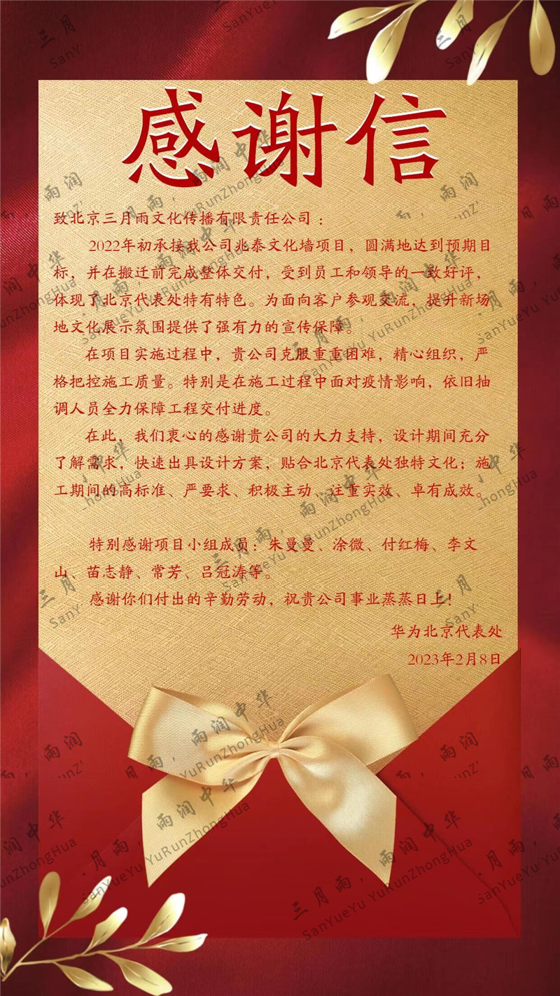以质量求生存,以信誉求发展。公司既要“金杯”“银杯”,更要客户的口碑。每一个项目务求特色第一、质量第一、信誉第一,让客户满意。截至目前,共收到全国人大常委会机关纪委等国家机关和省、市、县级客户表扬信(感谢信)近