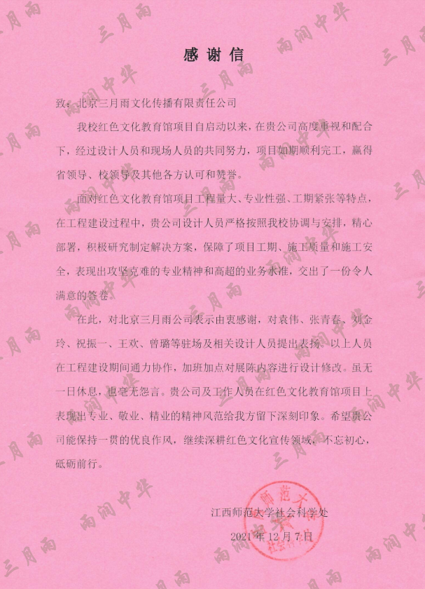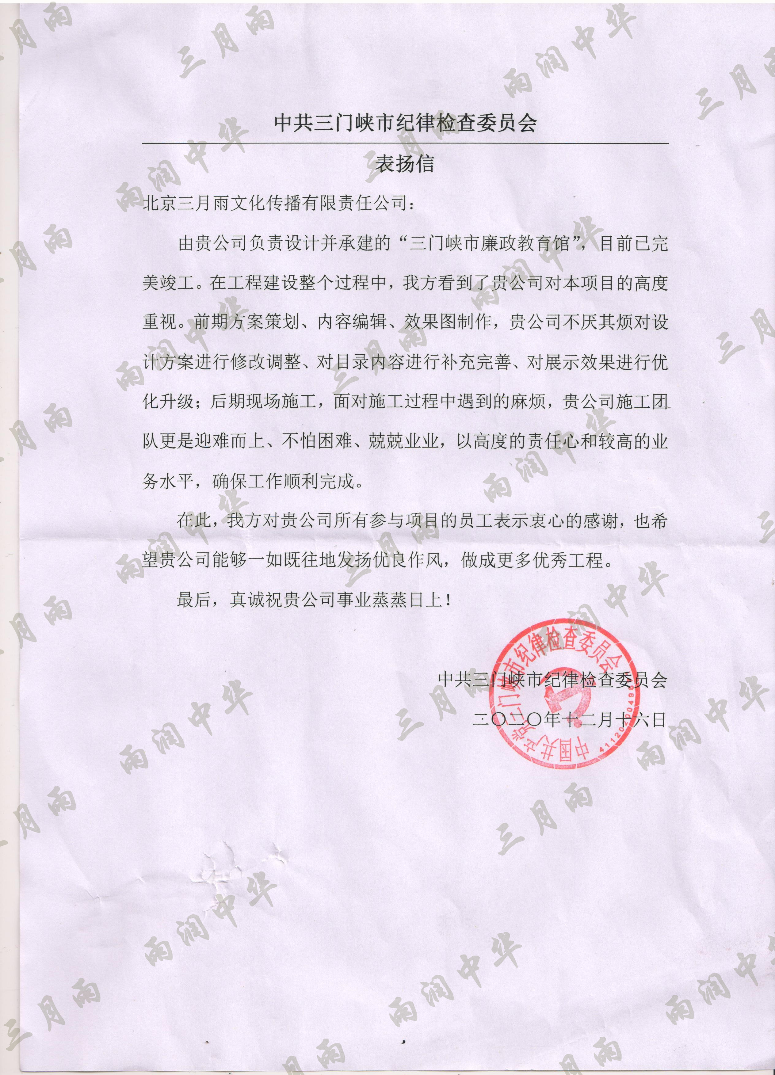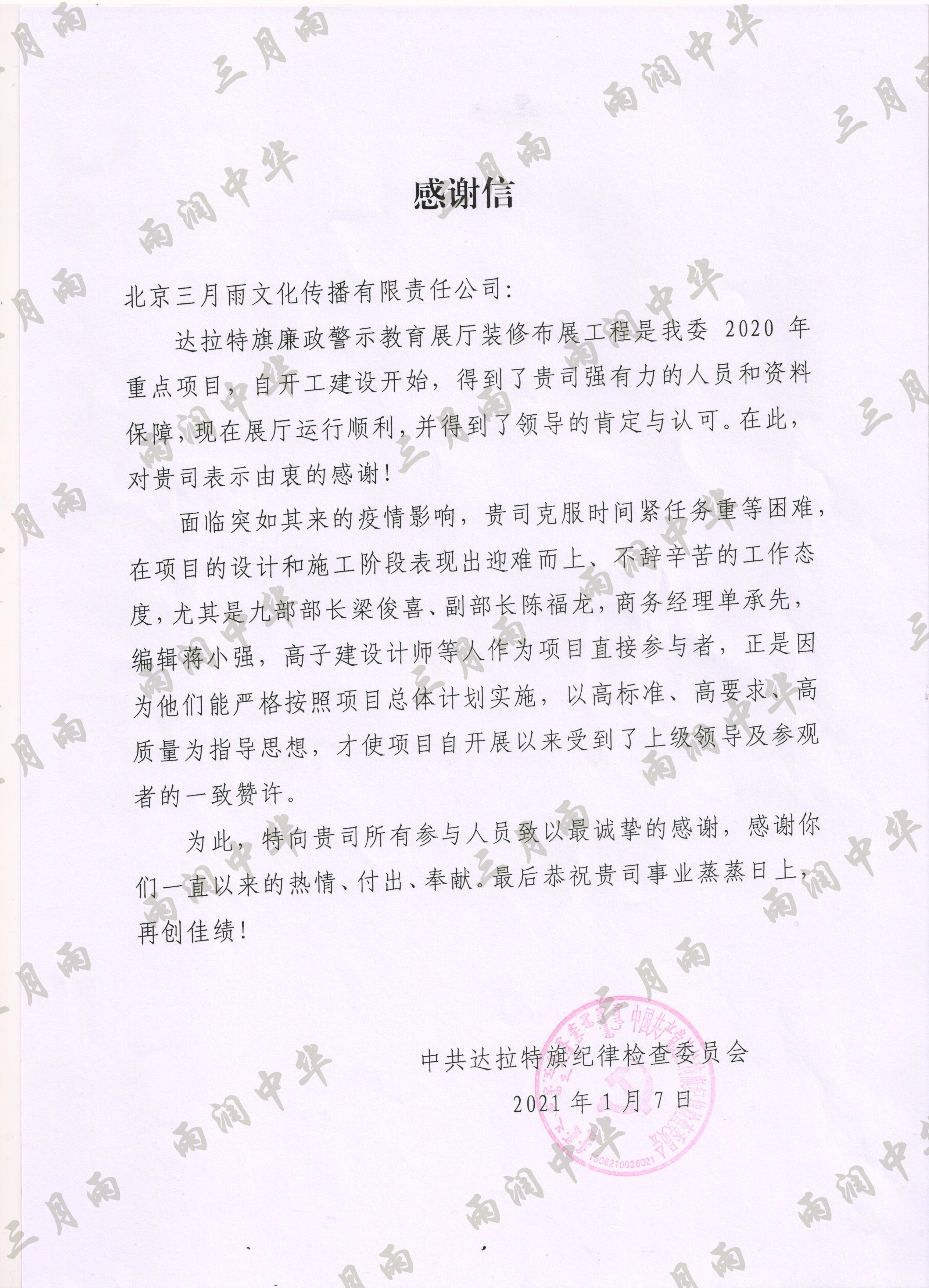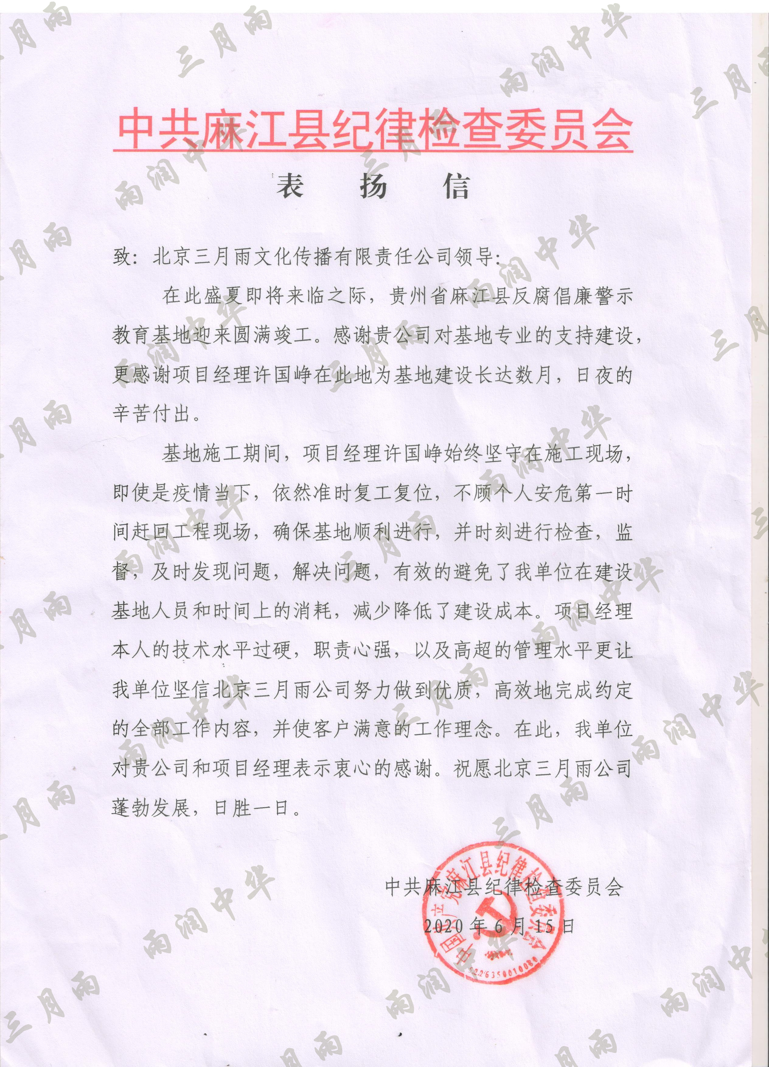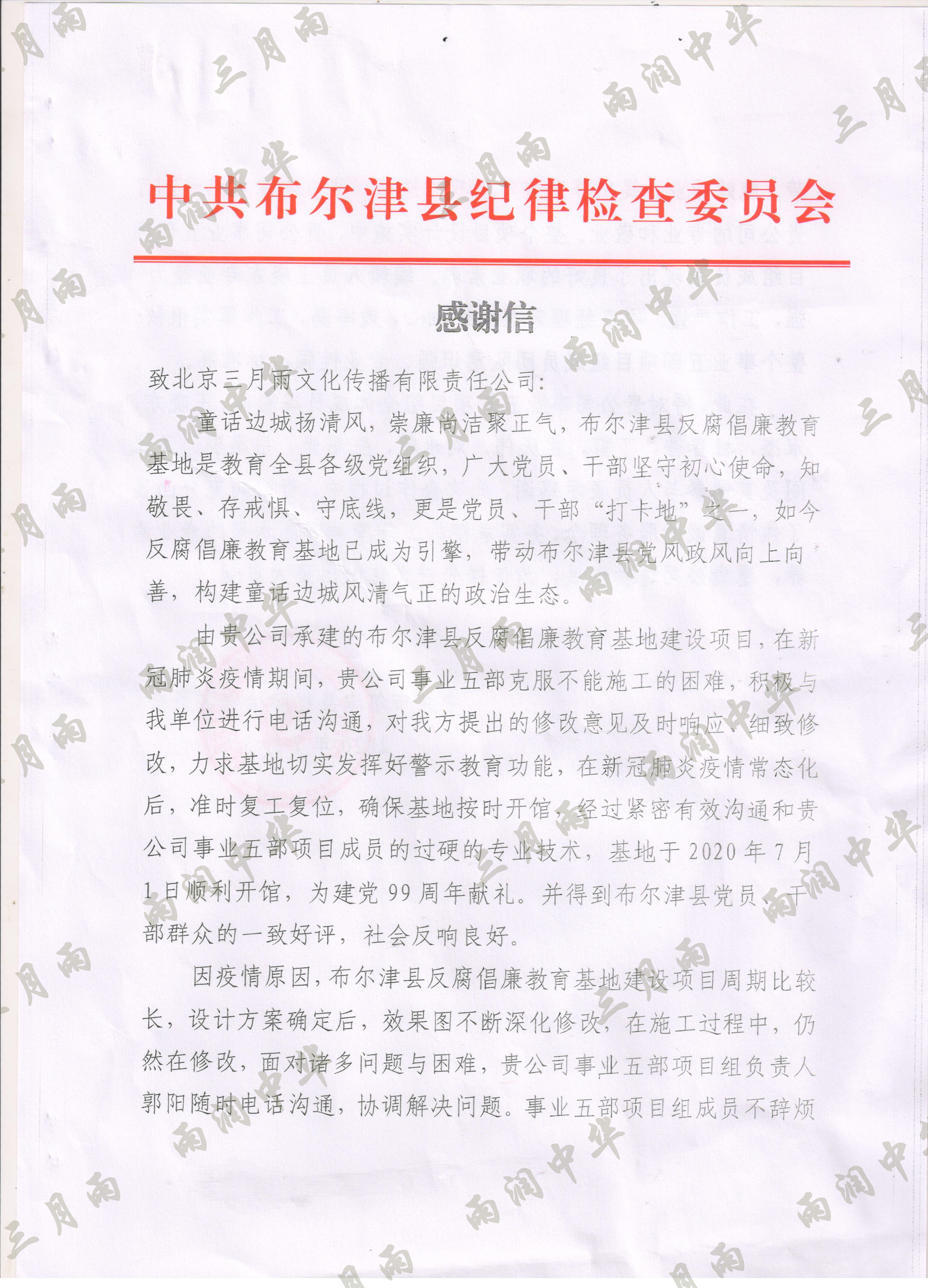 以质量求生存,以信誉求发展。公司既要“金杯”“银杯”,更要客户的口碑。每一个项目务求特色第一、质量第一、信誉第一,让客户满意。截至目前,共收到全国人大常委会机关纪委等国家机关和省、市、县级客户表扬信(感谢信)近