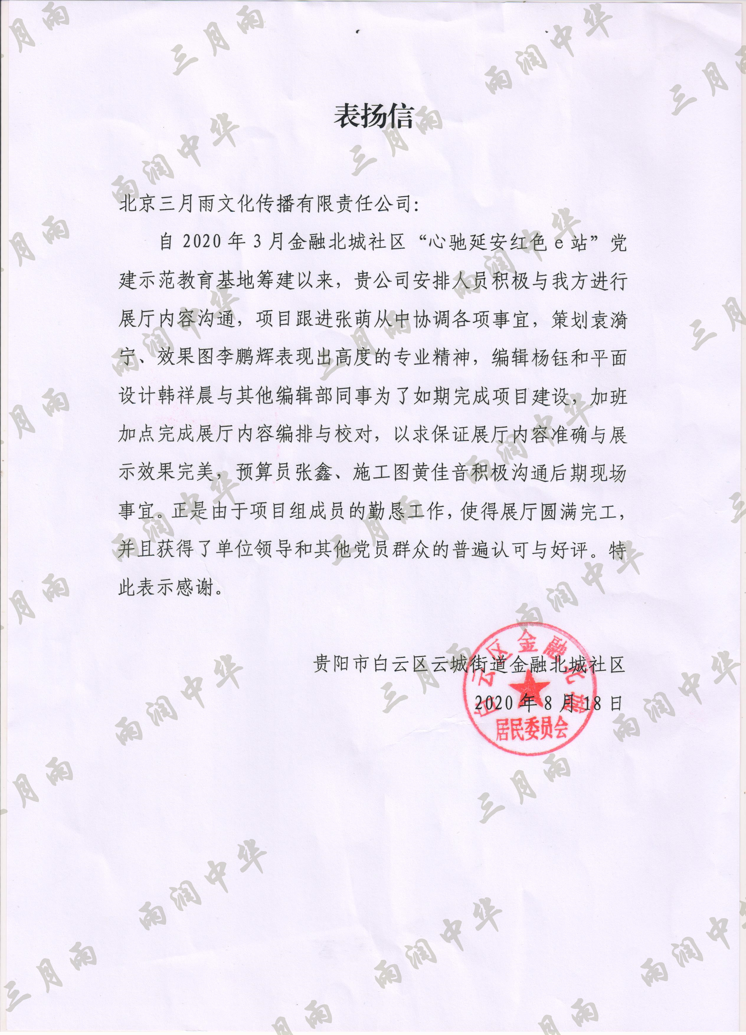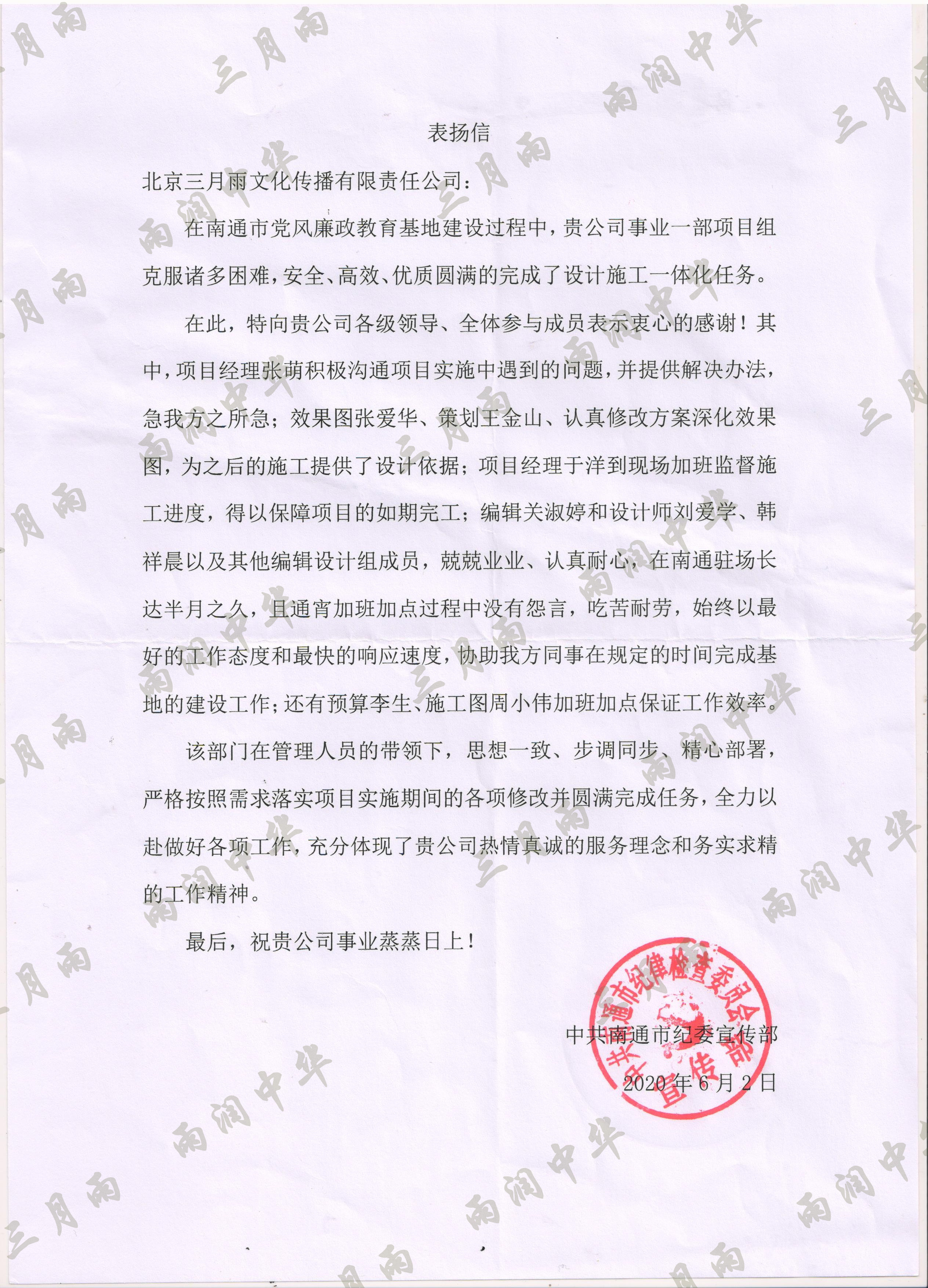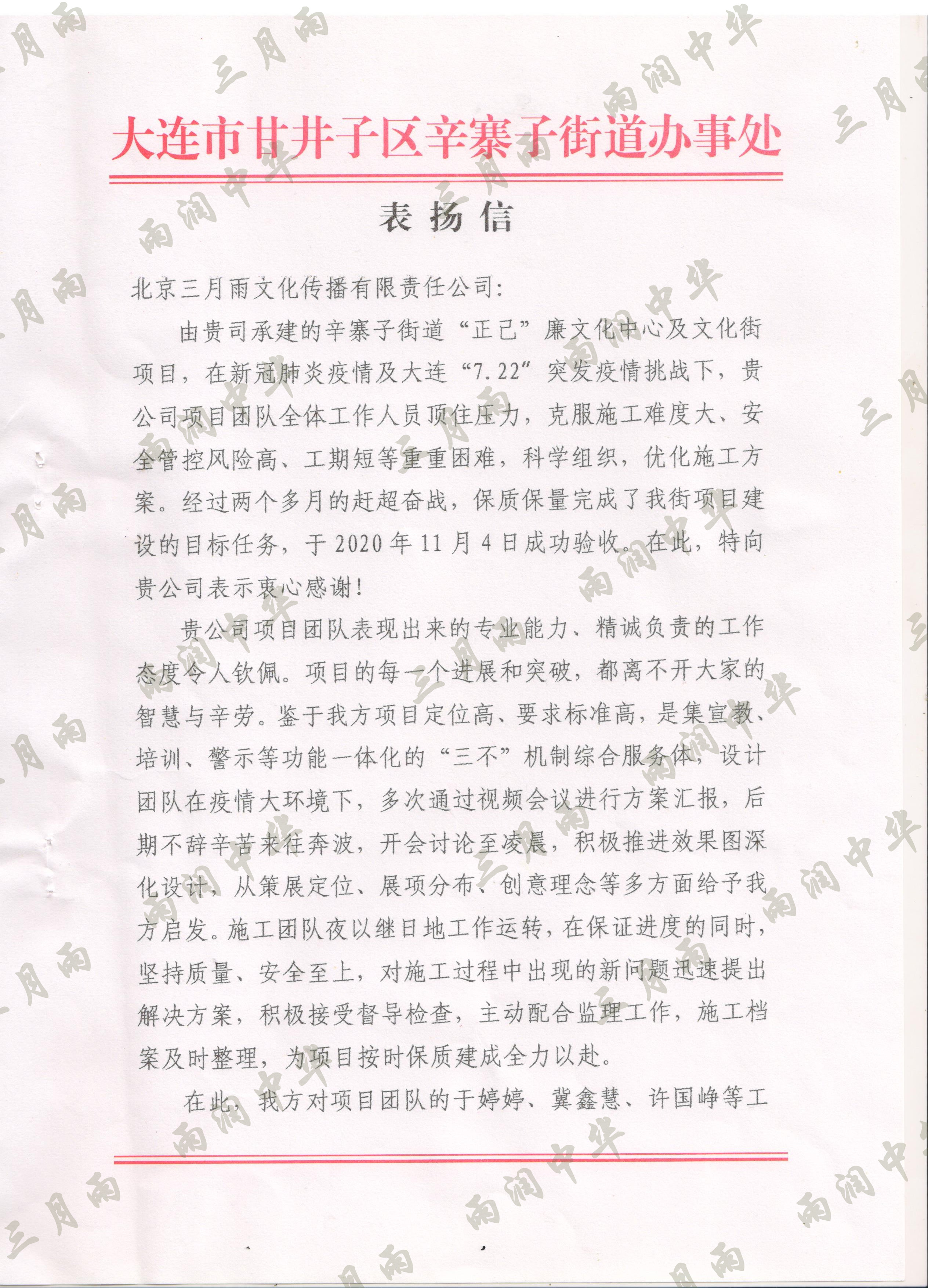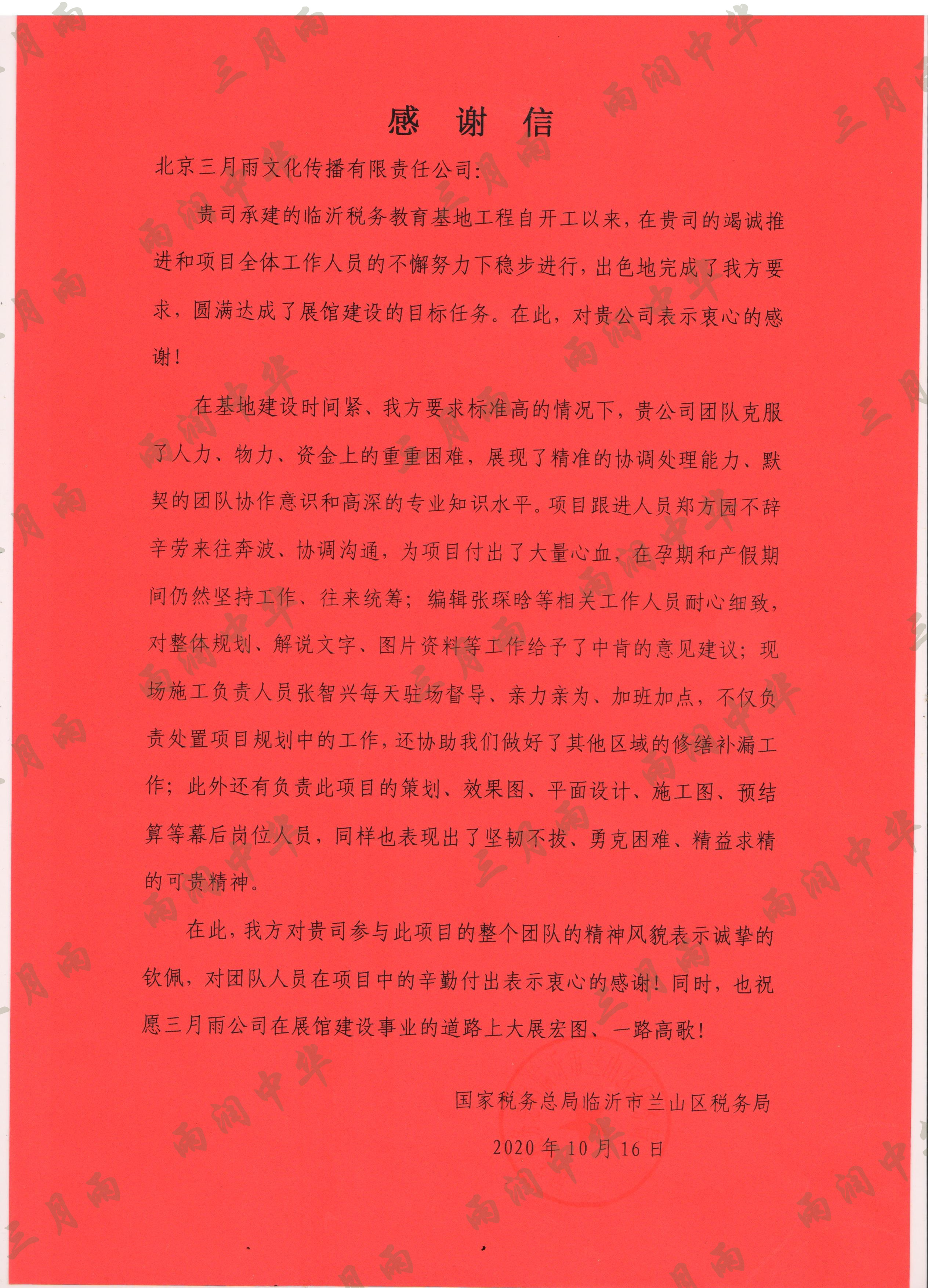 以质量求生存,以信誉求发展。公司既要“金杯”“银杯”,更要客户的口碑。每一个项目务求特色第一、质量第一、信誉第一,让客户满意。截至目前,共收到全国人大常委会机关纪委等国家机关和省、市、县级客户表扬信(感谢信)近