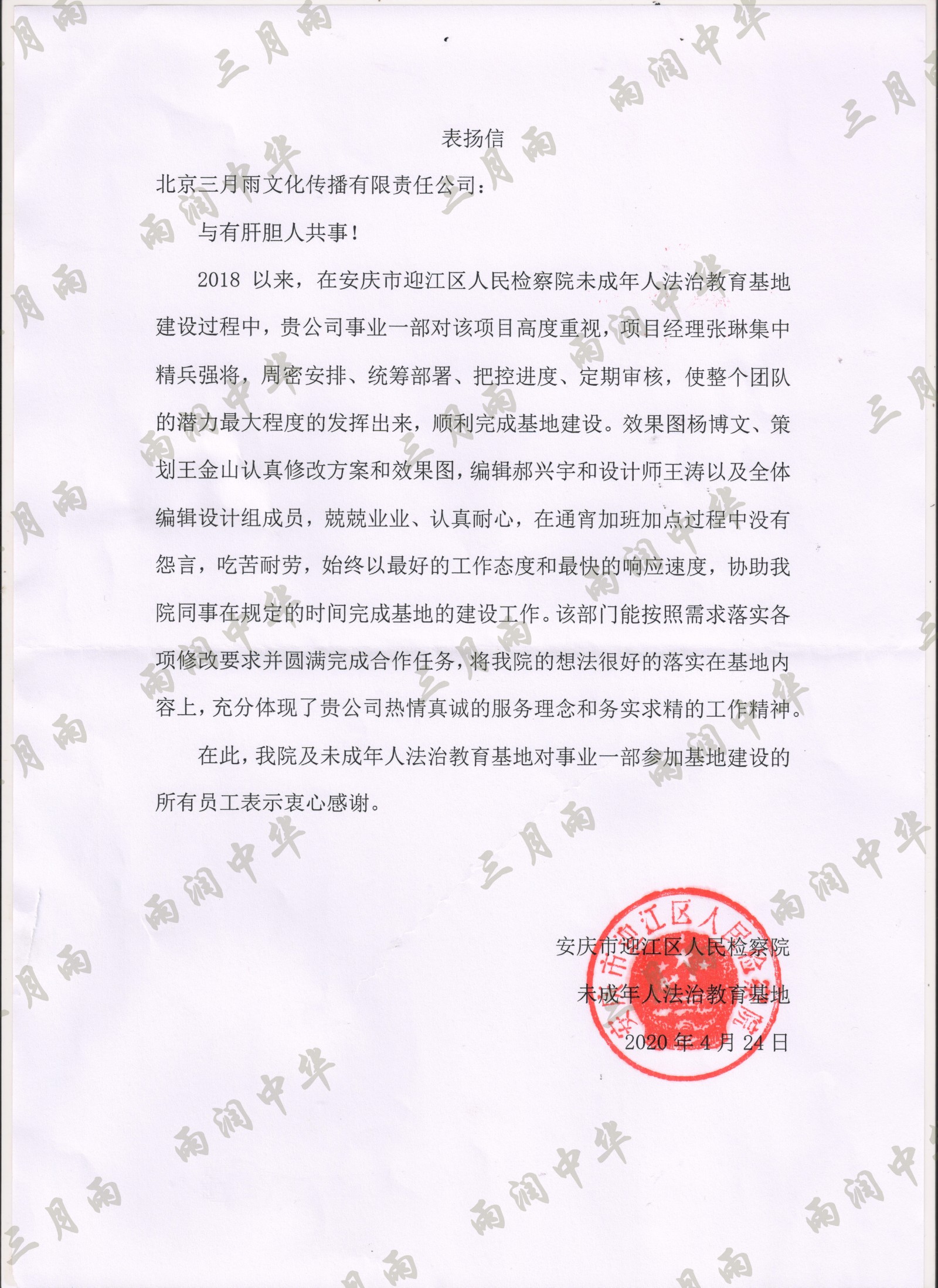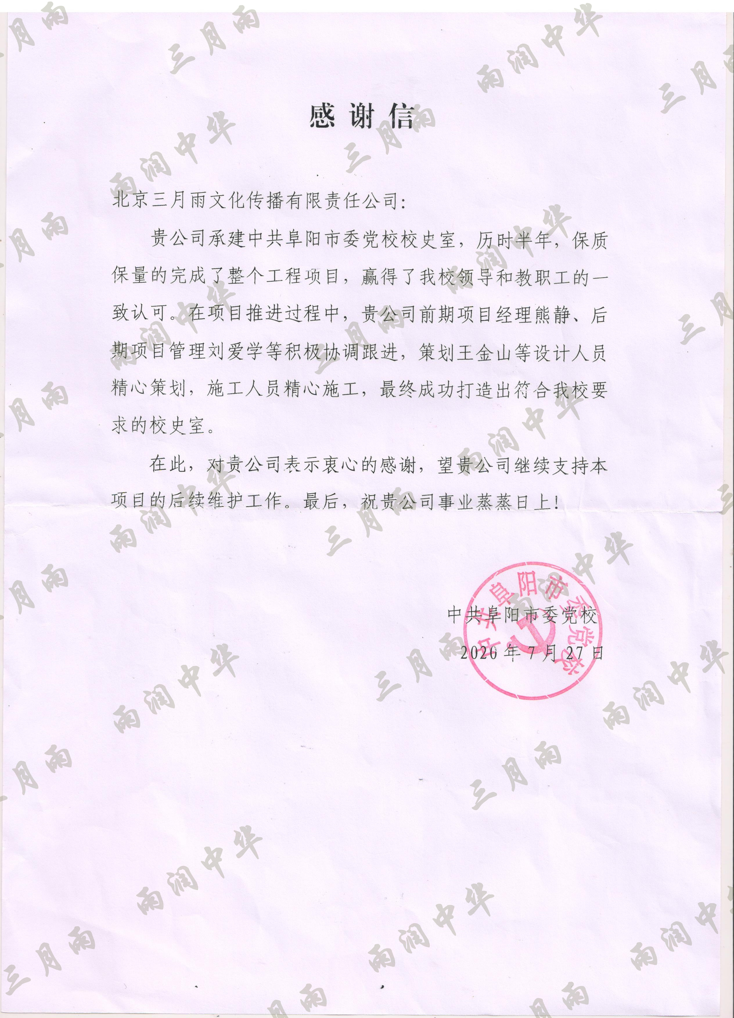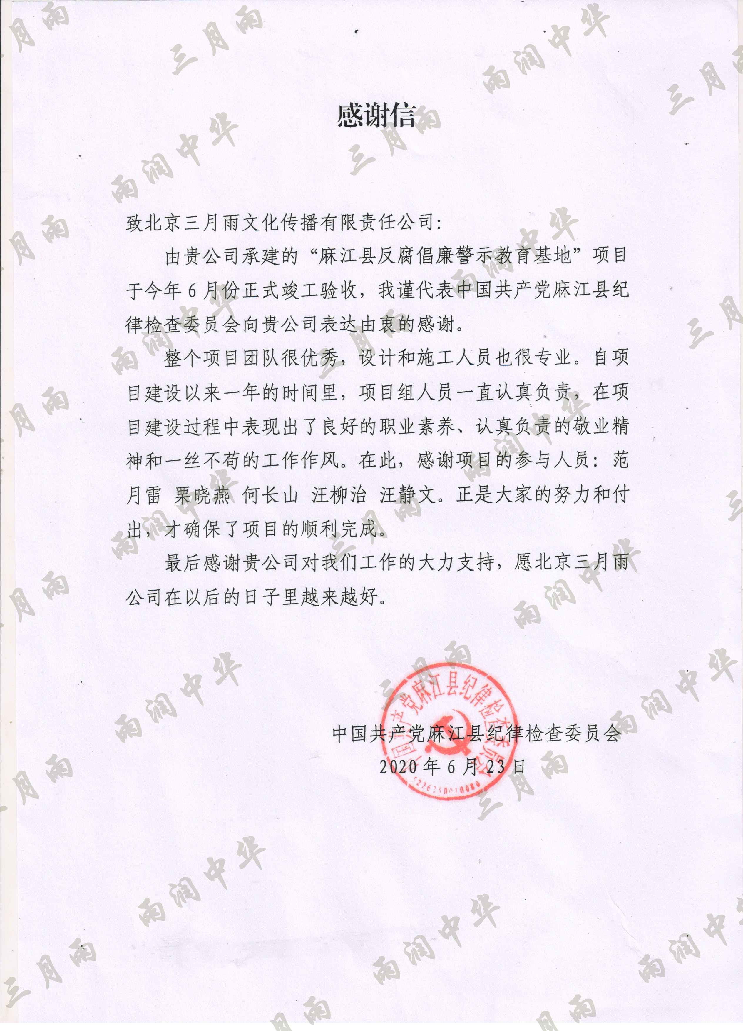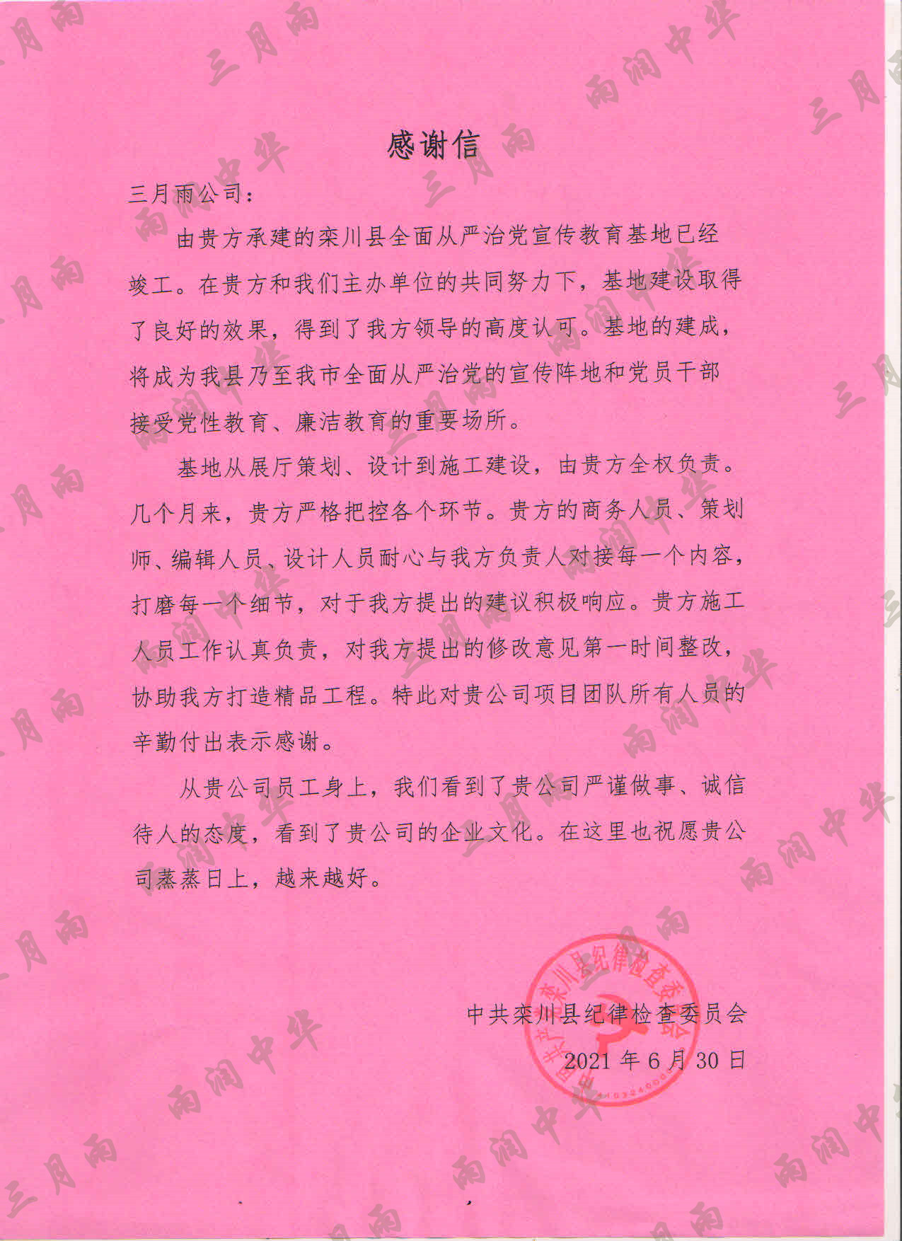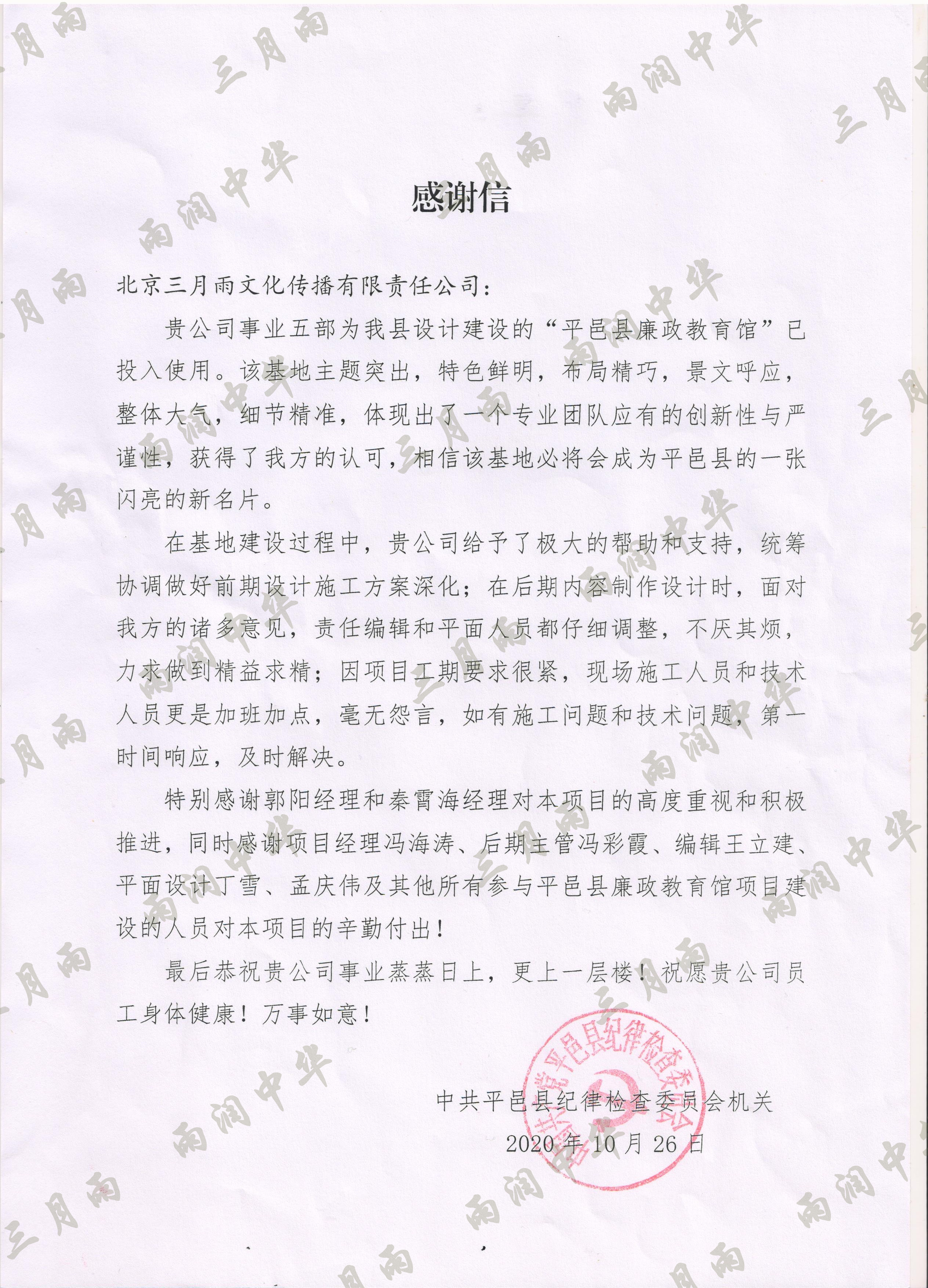 以质量求生存,以信誉求发展。公司既要“金杯”“银杯”,更要客户的口碑。每一个项目务求特色第一、质量第一、信誉第一,让客户满意。截至目前,共收到全国人大常委会机关纪委等国家机关和省、市、县级客户表扬信(感谢信)近