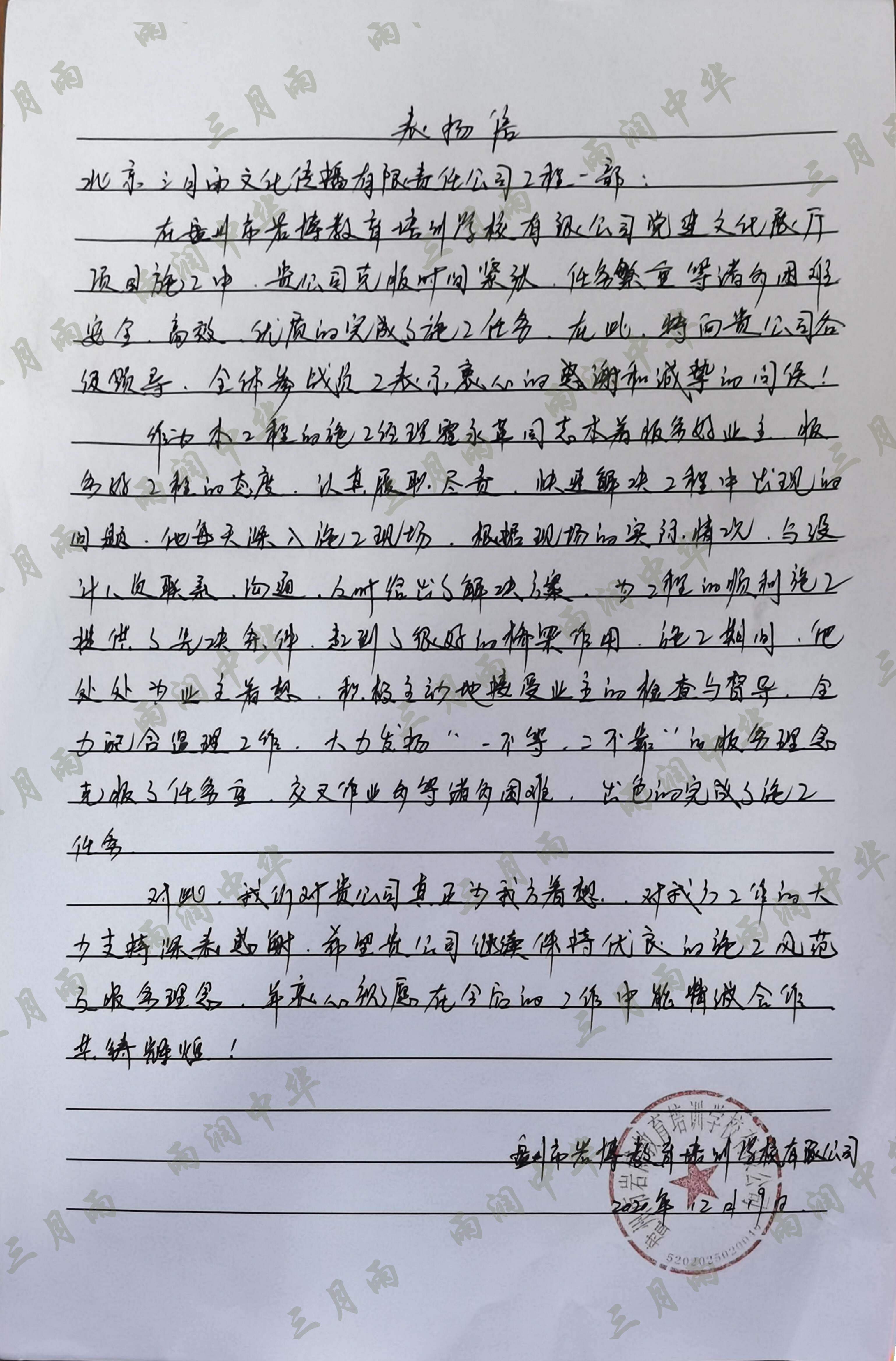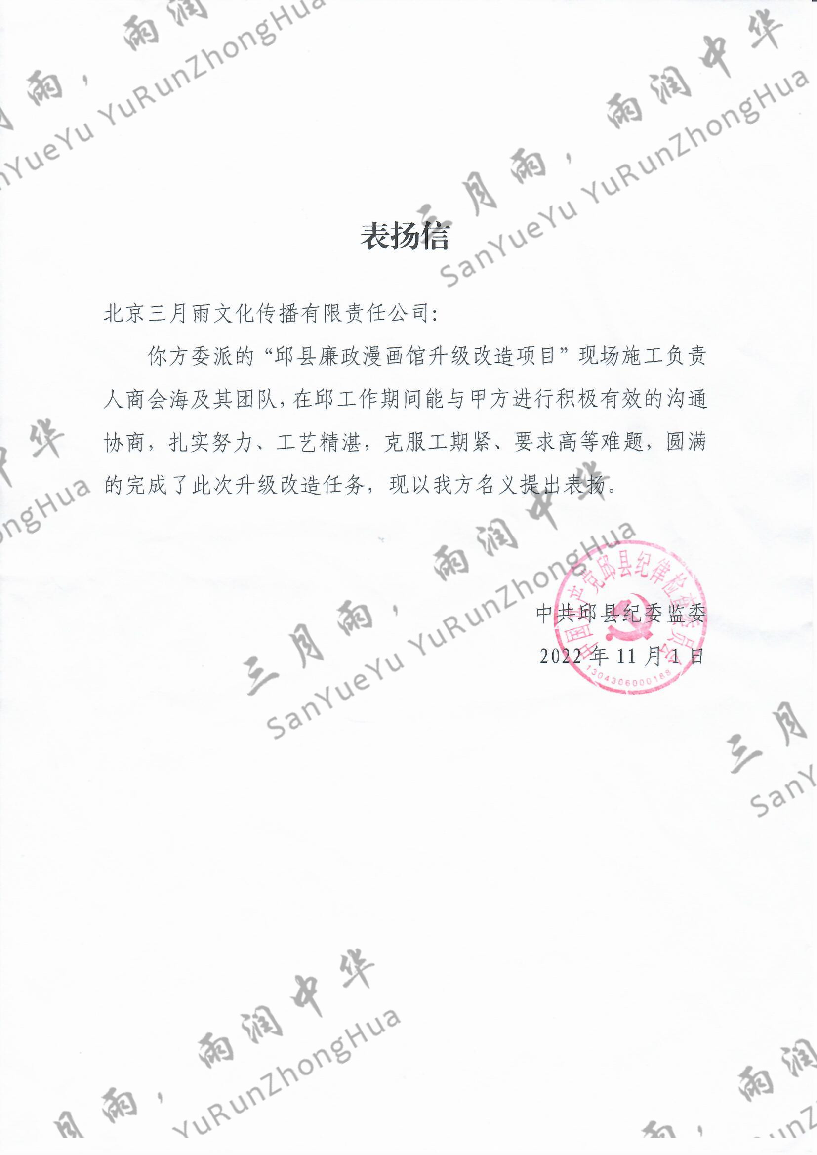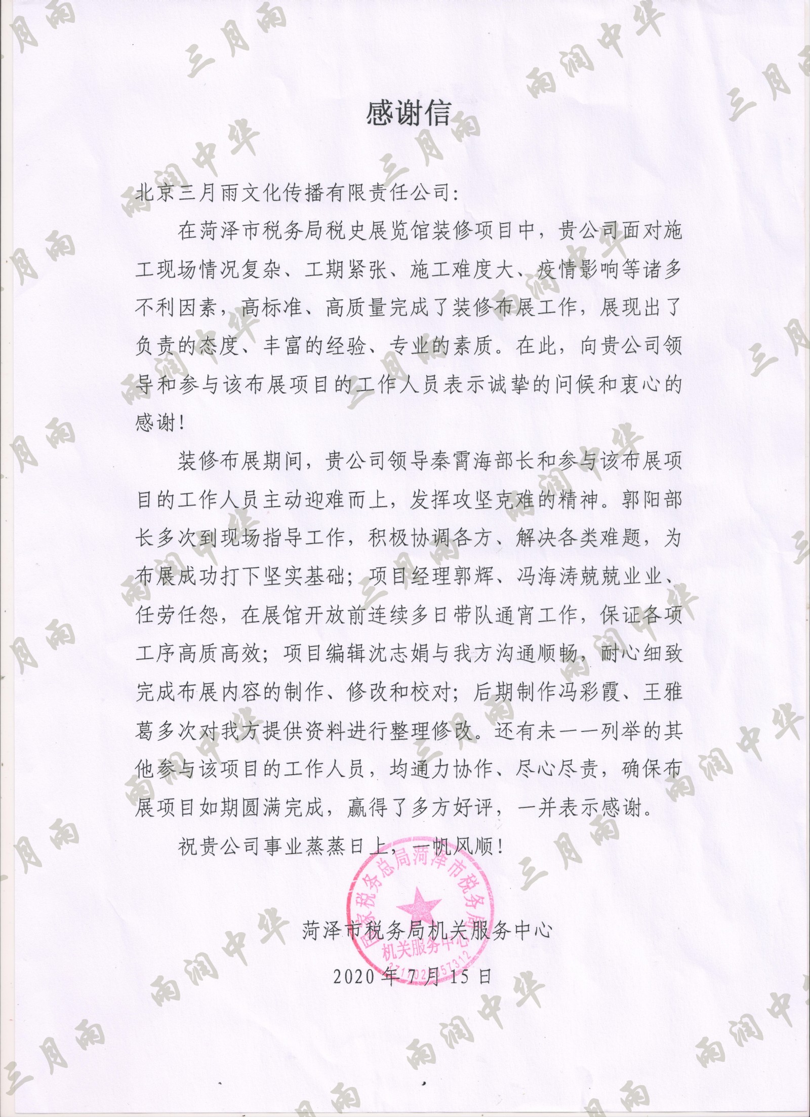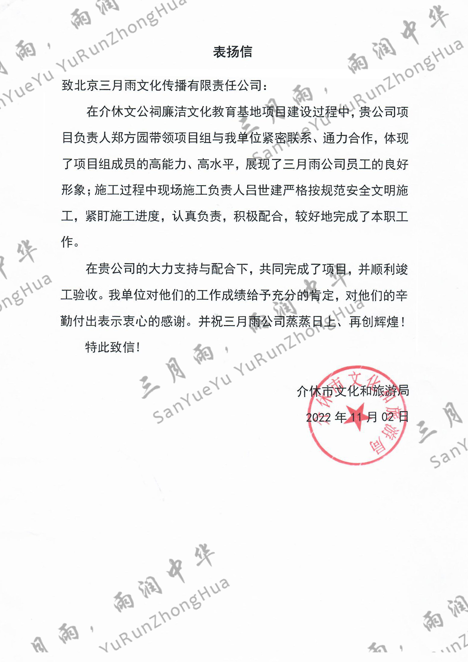 以质量求生存,以信誉求发展。公司既要“金杯”“银杯”,更要客户的口碑。每一个项目务求特色第一、质量第一、信誉第一,让客户满意。截至目前,共收到全国人大常委会机关纪委等国家机关和省、市、县级客户表扬信(感谢信)近