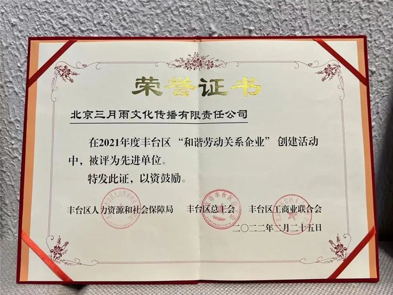 近日,由丰台区人力资源和社会保障局、丰台区总工会、丰台区工商业联合会等3家单位联合评审的2021年度丰台区“和谐劳动关系企业”先进单位公布结果,三月雨有幸入选。