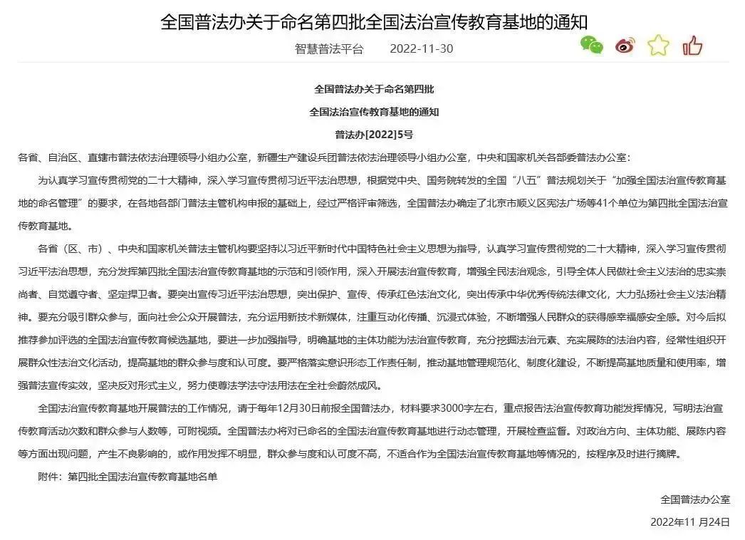 据了解,在此次命名评审中,全国普法办根据党中央、国务院转发的全国八五普法规划关于加强全国法治宣传教育展厅的命名管理的要求,在各地各部门普法主管机构申报的基础上,经过严格评审筛选,全国普法办确定了41个单位为第四批全国法治宣传教育基地。