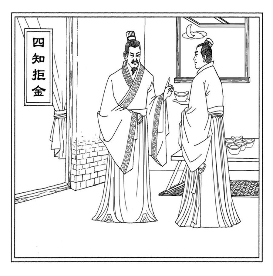 话说,东汉廉吏杨震,任荆州刺史时发现王密才华出众,便向朝廷举荐王密为昌邑县令。在杨震调任途中经过昌邑时,王密亲赴郊外迎接他。当夜,王密再次拜见杨震,两人相谈甚欢,不知不觉已到深夜。起身告辞时,王密从怀里拿出了十两黄金说:“感谢老师对我的栽培之恩。”杨震说:“因为你有真才实学,所以我才举荐你。可你这样,岂不是违背了我的初衷和对你的期望。”但王密却坚持说:“现在夜已深,没人知道的。”杨震声色俱厉地说:“天知,地知,我知,你知!怎么能没人知道呢?”王密惭愧不已,悄悄离开了。百姓因杨震为官清廉,不谋私利,给他取名叫“四知先生”。