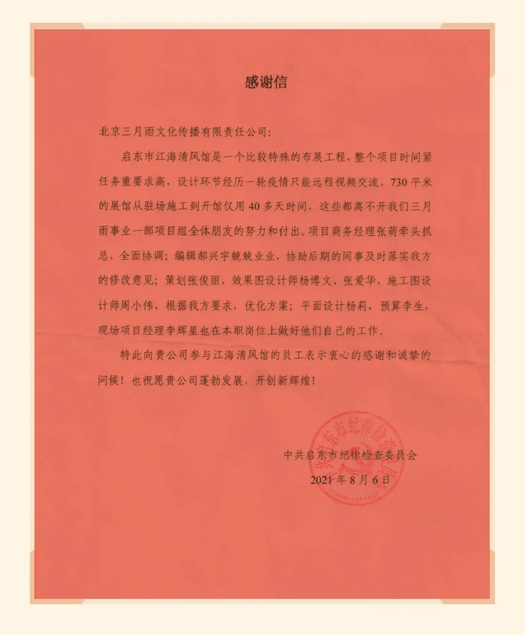 8月12日,三月雨集团收到一封来自中共启东市纪律检查委员会的感谢信,信中对集团项目人员在启东市江海清风馆的建设中表现出的协作、敬业精神,表示认可与感谢。